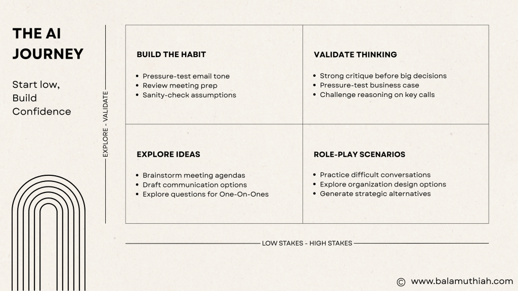 Build the Habit (top-left): As comfort grows, use AI for everyday validation tasks like pressure-testing email tone, reviewing meeting prep, or sanity-checking assumptions. You’re still in low-stakes territory, but now AI becomes a regular thinking partner.